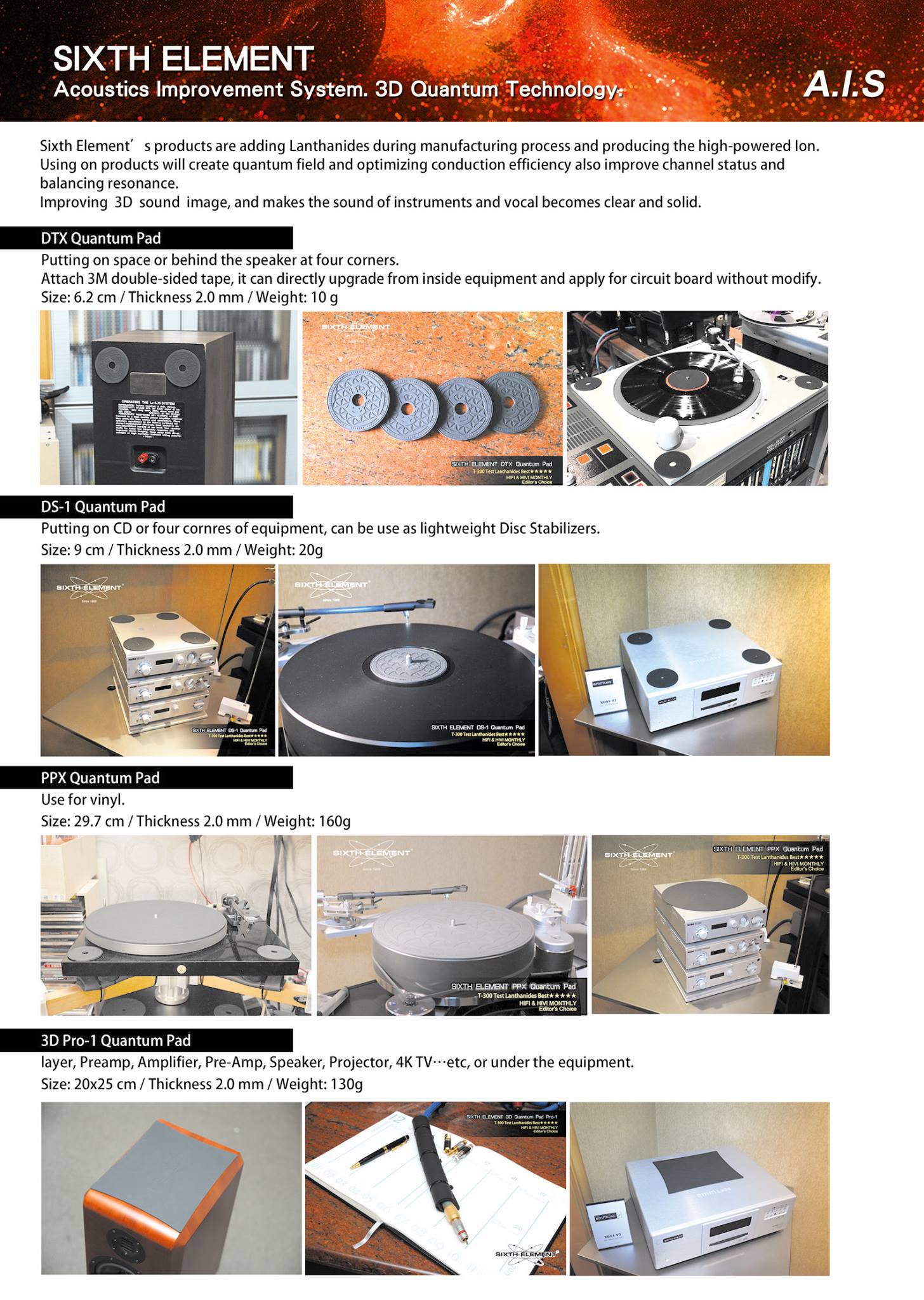 Sixth Element  A.I.S. uses state-of-the-art 3D Quantum technology to cancel off the bad resonance and drastically improve the 3D sound image.